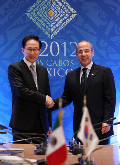 G20(주요 20개국) 정상회의 참석차 멕시코를 방문 중인 이 대통령은 이날 로스카보스 피에스타 아메리카노에서 정상회담을 열고 이같이 합의했다고 박정하 대변인이 밝혔다.
