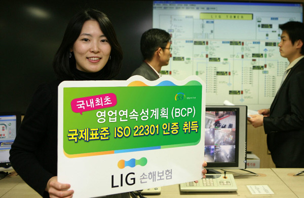 LIG손해보험은 28일 국내 기업으로는 최초로 영업연속성계획(BCP, Business Continuity Plan)에 대한 새로운 국제표준인 ‘ISO22301’ 인증을 취득했다고 밝혔다. BCP란 예상치 못한 재해나 재난으로 급작스럽게 업무가 중단됐을 때 최대한 빠른 시간 안에 핵심업무를 복구, 기업 경영의 연속성을 유지하기 위한 일련의 계획으로 미국, 영국, 일본 등 선진국에서는 BCP 구축을 제도화시켜 시행 중에 있다.