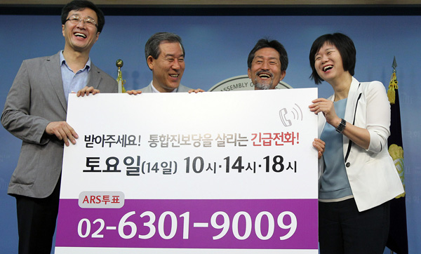 12일 오전 국회 정론관에서 통합진보당 천호선 전 대변인(왼쪽부터), 이홍우 비상대책위원, 강기갑 혁신비대위원장, 이정미 대변인이 ARS투표 참여를 부탁하는 기자회견을 열고 있다.
