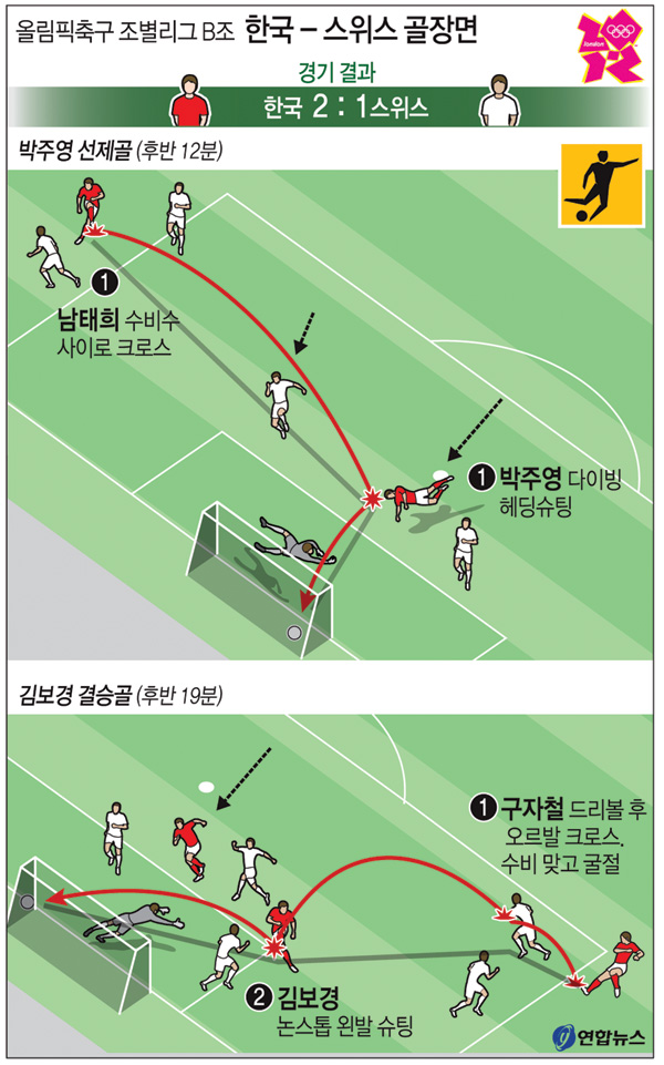 남태희가 오른쪽 측면에서 수비수 사이로 올린 크로스를 박주영이 달려들며 정확한 다이빙 헤딩슛으로 스위스의 골망을 가른 것.