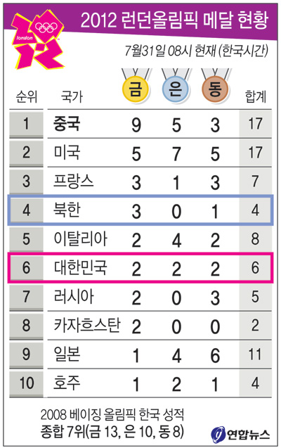이날 박태환이 은메달 1개를 획득한 데 그친 한국은 금 2개, 은 2개, 동메달 2개로 6위로 밀려났다.