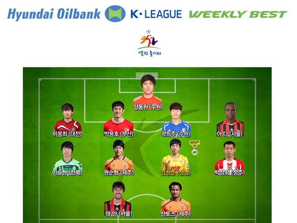 이밖에 ‘주간베스트 11’에는 공격수 부문에 28일 서울 월드컵경기장에서 6골을 주고받으며 화끈한 공격 축구를 펼친 제주 유나이티드와 FC서울에서 산토스(제주)와 데얀(서울)이 뽑혔고 미드필더 부문에는 김성준 외에 박상희(상주 상무), 권순형(제주), 이승현(전북 현대)이, 수비수 부문에는 아디(서울), 곽희주(수원 블루윙즈), 박용호(부산 아이파크), 이웅희(대전 시티즌)가 각각 선정됐으며 골키퍼에는 양동원(수원)이 이름을 올렸다.