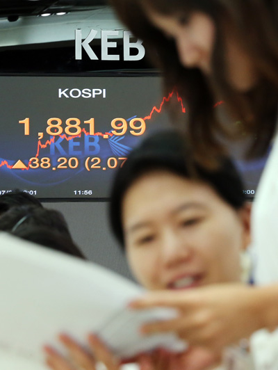 유럽 재정위기가 완화될 것이라는 기대가 고조돼 코스피가 38포인트 이상 급등했다. 31일 코스피는 전날 종가보다 38.20포인트(2.07%) 오른 1,881.99에 장을 마감했다. 이는 종가 기준으로 지난달 21일 이후 가장 높은 수준이다. 지수는 1,945.46으로 출발, 시간이 갈수록 상승폭을 확대해 오후들어 1,896.83까지 오르며 1,900선을 넘보기도 했다. 한편 서울 외환시장에서 원화에 대한 달러화 환율은 7.0원 하락한 1,130.6원에 장을 마감했다. 사진은 이날 오후 명동 외환은행 본점 딜링룸.
