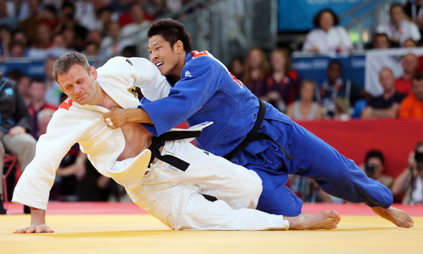 김재범은 1일 새벽 영국 런던의 엑셀 런던 노스아레나에서 열린 대회 유도 남자 81㎏급 결승에서 올레 비쇼프(독일·랭킹 5위)를 상대로 두 차례 안다리걸기를 모두 유효로 연결하면서 유효승을 거뒀다.