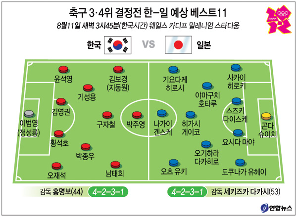 홍명보 감독이 이끄는 한국 대표팀은 11일 새벽 3시 45분(한국시간) 영국 웨일스 카디프의 밀레니엄스타디움에서 일본과 런던올림픽 동메달결정전을 치른다.