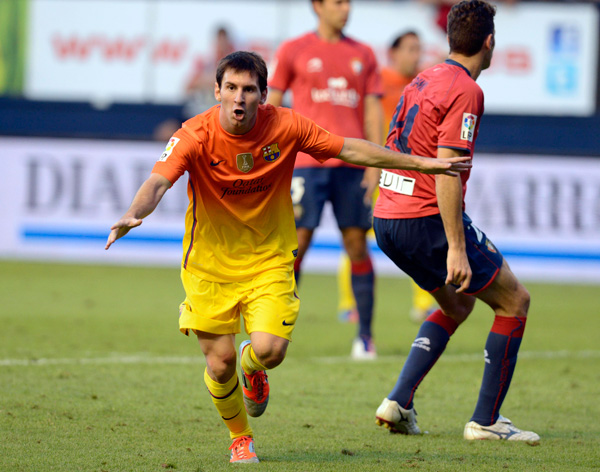 메시는 28일 새벽(한국시간) 스페인 팜플로나의 엘 사다르 경기장에서 열린 2012-2013 스페인 프로축구 프리메라리가 2라운드 원정에서 오사수나를 상대로 0-1로 지고 있던 후반 31분 동점골에 이어 4분 뒤 역전골을 넣어 팀의 2-1 역전승을 일궈냈다.