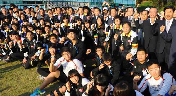 김문수 도지사는 “지난해 경기도에서 열린 전국체전에서 종합우승 10연패라는 대업을 이뤄낸 선수들이 이제 종합우승 11연패에 도전한다”며 “선수들의 늠름한 모습을 보니 11연패를 충분히 달성할 것으로 믿는다”고 말한 뒤 선수단과 함께 파이팅을 외쳤다.