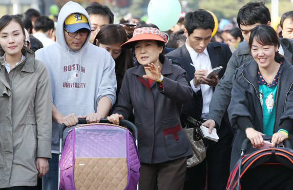 새누리당 박근혜 대선 후보가 28일 오후 서울 송파구 올림픽공원에서 열린 ‘위드베이비 유모차 걷기대회’에 참석, 아이를 키우는 부모들과 함께 걸으며 육아 문제에 대해 이야기하고 있다.