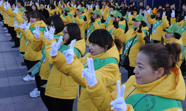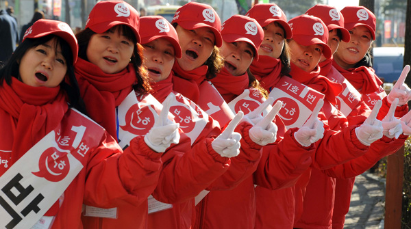 18대 대통령선거를 앞두고 본격적인 선거운동에 돌입한 27일 새누리당 선거운동원(위)과 민주통합당 선거운동원(아래)들이 수원종합운동장과 수원역에서 유권자들에게 지지를 호소하고 있다.