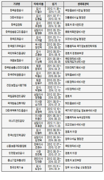 나머지 공공기관의 기관장ㆍ임원은 담당 정부부처 출신 공무원이 대부분 차지했다.