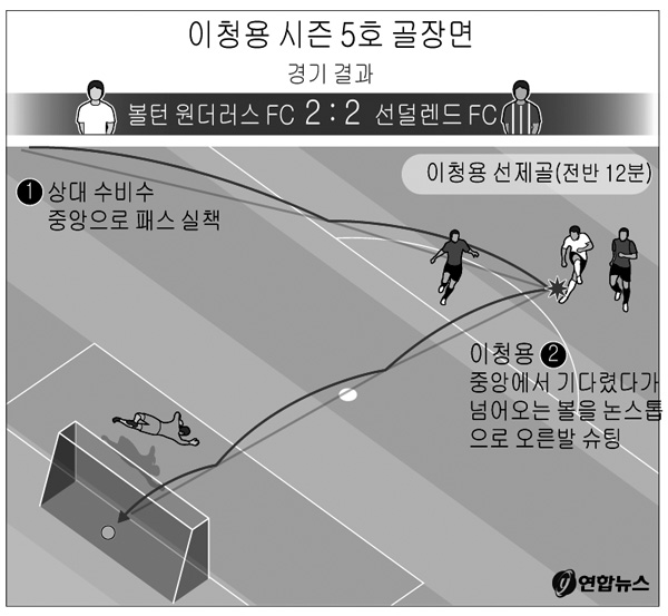 이청용은 6일(한국시간) 영국 볼턴의 리복 스타디움에서 열린 선덜랜드와의 잉글랜드축구협회(FA)컵 64강전에서 전반 12분 선제골을 뽑았다.