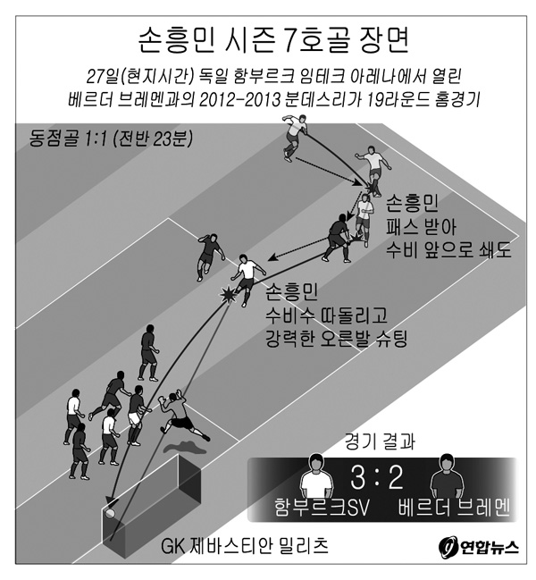 손흥민은 27일(현지시간) 독일 함부르크의 임테크 아레나에서 열린 베르더 브레멘과의 2012~2013 분데스리가 19라운드 홈경기에서 팀이 0-1로 뒤지던 전반 23분 균형을 맞추는 골을 넣었다.