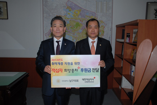 인천시 남구의회는 29일 의장실에서 대한적십자 인천지사를 통해 적십자 특별회비를 전달했다. 유재호 의장은 “적십자 회비는 어려운 경제사정으로 고통받는 저소득층을 지원하는 등 인천을 더욱 따뜻하게 만든다”며 구민들의 적극적인 관심과 참여를 당부했다.