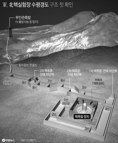 군은 이 영상에 나온 수평갱도 내부구조 모습을 캡쳐했다. 길이 1㎞ 내외의 수평갱도는 달팽이관 모양으로 이뤄졌으며 9개의 차단문이 설치됐다.