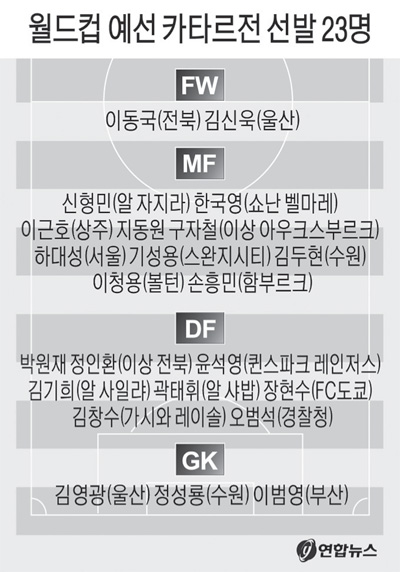 최강희 축구대표팀 감독은 4일 서울 종로구 신문로 축구회관에서 22일 시리아와의 평가전과 26일 카타르와의 월드컵 최종예선 5차전(서울월드컵경기장)에 나설 23명의 대표선수 명단을 발표했다.