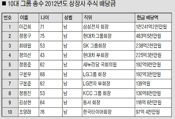 4일 재벌닷컴이 총수가 있는 자산 순위 10대 그룹 총수들의 2012 회계연도 상장사 주식보유로 올해 지급받는 배당금(표·중간배당 포함)을 조사한 결과, 작년(2천560억원)보다 1.5% 증가한 2천599억원으로 집계됐다.