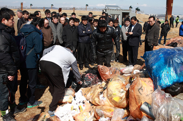 수도권매립지 쓰레기 상태 살펴보는 공무원