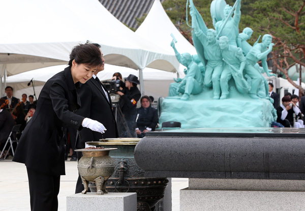 한편 검은색 정장 차림의 박 대통령은 숙연한 표정으로 ‘5·18 민주항쟁 추모탑’에 헌화, 분향한 뒤 묵념했다. 박 대통령은 국가보훈처가 제창을 거부해 논란이 된 ‘임을 위한 행진곡’의 합창 때 기립했으나 노래를 따라 부르지는 않았다.
