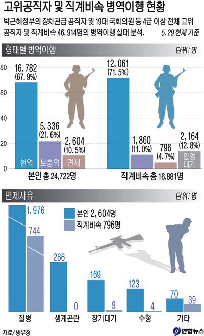 특히 1급 이상 고위 공직자 병역면제율은 15.4%로 질병, 수형, 생계곤란, 고령, 장기대기 사유로 면제됐다. 질병은 근시, 폐결핵, 수핵탈출증, 선천성 운동장애 등이다. 직계비속 1만6천881명 중 1만6천85명(95.3%)은 현역과 보충역 복무를 끝냈거나 입영 대기 중이다.