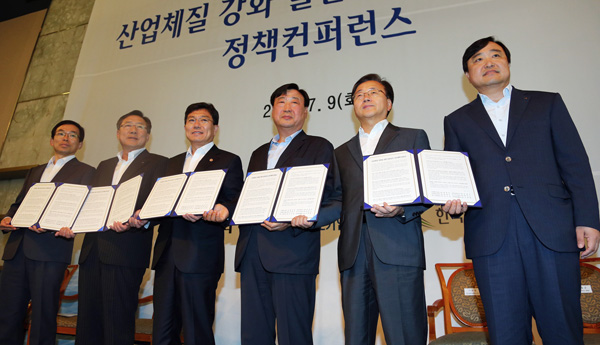 대한상공회의소, 전국경제인연합회, 한국무역협회, 중소기업중앙회, 한국경영자총협회 등 경제5단체와 산업통상자원부는 9일 서울 플라자호텔에서 ‘산업체질 강화를 위한 실천계획 선포식’을 가졌다.