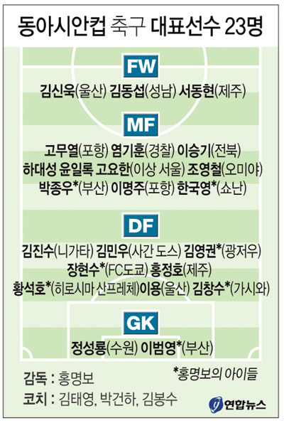 20일 개막하는 2013 동아시안컵을 통해 데뷔전을 치르는 홍명보 축구대표팀 감독은 11일 파주NFC(대표팀트레이닝센터)에서 2012년 런던올림픽에 나선 이범영, 박종우(이상 부산), 김영권(광저우), 김창수(가시와) 등 ‘홍명보의 아이들’이 대거 포함된 23명의 명단을 발표했다.