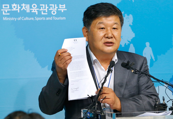 문화체육관광부 노태강 체육국장은 22일 서울 문체부 기자실에서 브리핑을 열어 “최종 신청서에는 정부 보증서 원본이 들어간 만큼 계속 유치작업을 추진하되 그 과정의 문제점을 엄정히 조사해 처벌하고 유치 이후에도 지원은 어렵다는 뜻을 유치위에 공식 통보했다”고 밝혔다.
