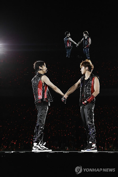 석양이 뉘엿뉘엿 넘어가던 지난 17일 오후 일본 요코하마 닛산 스타디움에서 동방신기는 훤칠한 키가 돋보이는 금빛 의상을 입고 랩, 진성, 가성이 오가는 이 노래를 라이브 밴드 반주에 맞춰 열창했다.