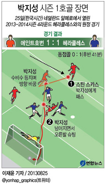 박지성은 25일 네덜란드 알멜로에서 열린 2013~2014시즌 4라운드 헤라클레스와의 원정 경기에서 후반 21분 교체 선수로 출전해 후반 41분 1-1을 만드는 동점골을 터뜨렸다. 박지성의 시즌 1호골이자 복귀 후 첫 골이다.
