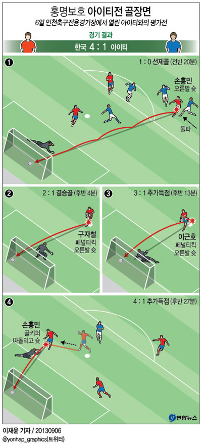 홍명보 감독 체제 아래서 처음 대표팀에 합류해 선발로 나선 손흥민은 전반 20분 미드필드 지역 중앙에서 볼을 잡아 단독 쇄도, 수비수 한 명을 제친 뒤 페널티아크 왼쪽에서 강력한 오른발 슈팅으로 아이티 골대 왼쪽 구석에 볼을 꽂았다.
