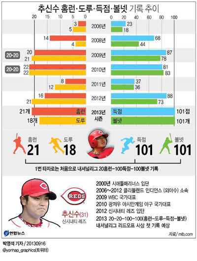 이로써 추신수는 1번 타자로서는 처음으로 내셔널리그에서 20홈런-100득점-100볼넷을 기록한 선수가 됐다. 종전까지는 아메리칸리그에서만 네 차례 있었을 뿐이다.