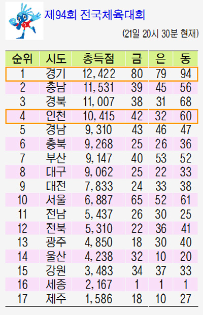 도는 21일 인천광역시 일원에서 계속된 제94회 전국체육대회 4일째 44개 종목 중 13개 종목이 마무리 된 가운데 롤러에서 2년 만에 종목 정상을 되찾았고 세팍타크로도 11년 만에 종목우승컵을 들어올렸으며 카누가 종목 3위에 입상하는 등 금 80개, 은 79개, 동메달 94개로 종합점수 1만2천422점으로 종합 선두로 올라섰다.