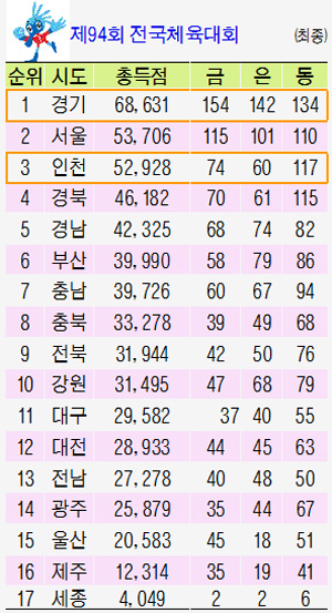 도는 이날 막을 내린 대회 총 44개 종목에서 금 154개, 은 142개, 동메달 134개로 종합점수 6만8천631점을 획득하며 ‘영원한 숙적’ 서울시(금 115·은 101·동 110, 5만3천706점)와 개최지 인천시(금 74·은 60·동 117, 5만2천928점)를 제치고 12년 연속 종합우승기와 우승컵을 들어올렸다.