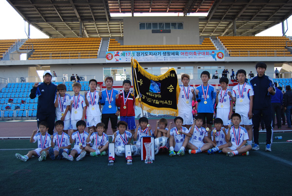 - 의정부시가 지난달 20일 하남종합운동장에서 막을 내린 제17회 경기도지사기 생활체육 어린이 축구대회에서 1부 정상에 올랐다. 또 2부에서는 하남시가 패권을 안았다. 의정부시 선수단이 우승기를 들고 기념촬영을 하고 있다.