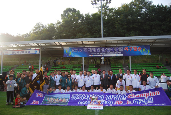 - 안양시 남부클럽과 평택시 LG전자가 지난달 9일 수원월드컵경기장 보조구장에서 벌어진 2013 경기사랑 클럽최강전 축구 지역부와 직장부에서 각각 우승을 차지했다. 안양시 남부클럽과 이원성 도생활체육회장, 엄성용 도축구연합회장을 비롯한 대회 임원이 우승기를 들고 기념촬영을 하고 있다.