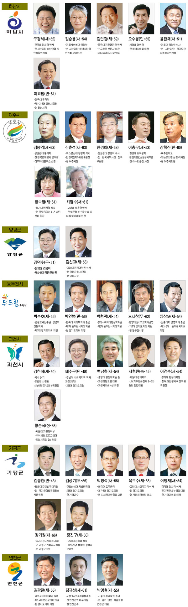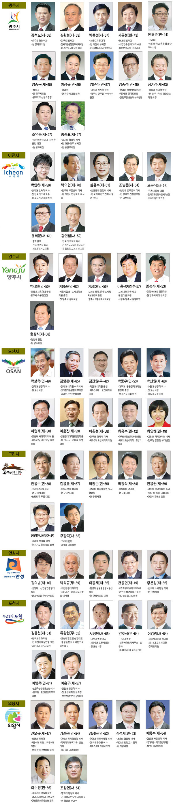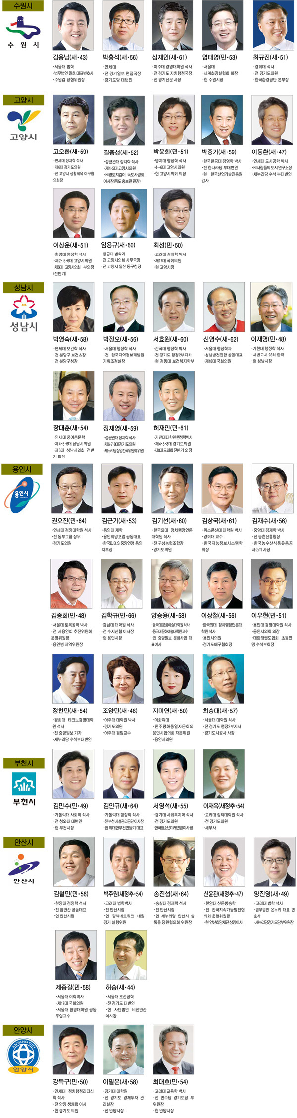 경기도 새=새누리당, 민=민주당, 통=통합진보당, 정=정의당, 새정추=새정치추진위원회, 녹=녹색당, 무=무소속 ※ 인물 가나다 순 게재
