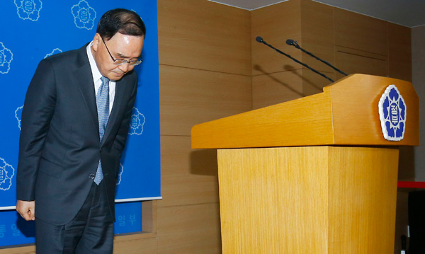 정 총리는 회견에 앞서 박근혜 대통령에게 사의를 전달했으며, 박 대통령은 정 총리의 사의를 수용하면서도 사표 수리 시기는 사고 수습 이후로 일단 미뤘다.