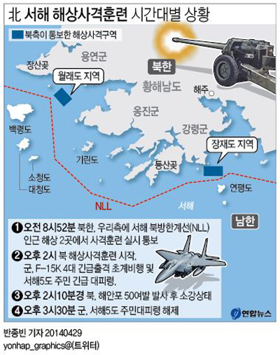 자신들이 사격구역으로 설정한 백령도와 연평도 인근 북쪽 해상으로 각각 25발가량을 쐈으며 모두 자신들의 지역인 NLL 이북 3㎞ 해상에 떨어졌다.