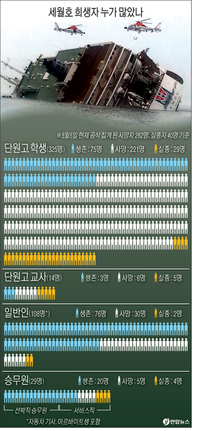 실종자 중 학생은 29명이며 교사 5명, 일반인 2명, 승무원 4명 등이다.