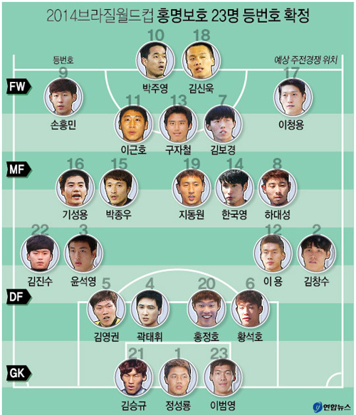 대한축구협회는 19일 홈페이지를 통해 “홍명보 감독을 비롯한 대표팀 코칭스태프들이 회의를 통해 선수들의 등번호를 확정했다”며 “지금까지 경험에 비추어 선수들이 선호하는 번호를 위주로 배정했다”고 설명했다.