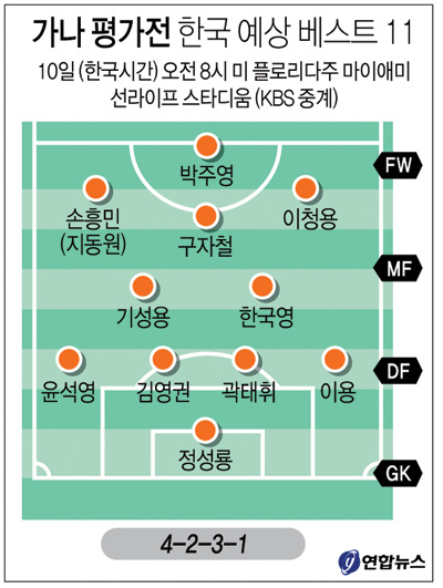 홍 감독은 월드컵 무대에 나설 선수를 뽑기 위한 마지막 테스트 무대였던 지난 3월 그리스전에 이어 국내 마지막 평가전이었던 지난달 28일 튀니지전까지 자신이 구상해온 ‘베스트 11’을 가동했던 만큼 이번 가나전도 크게 다르지 않을 것으로 보인다.