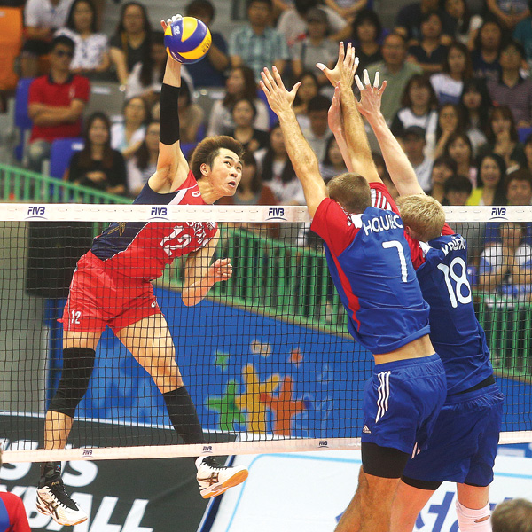 1세트에 전광인과 서재덕(이상 수원 한국전력)의 쌍포가 불을 뿜으면서 1세트를 25-16으로 가볍게 따낸 한국은 2세트 들어 중앙속공이 살아난 체코에 일진일퇴의 공방을 벌이며 팽팽한 접전을 이어갔다.