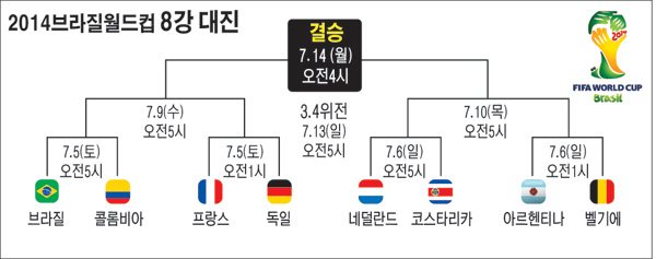 같은 날 포르탈레자에서는 통산 6번째 우승을 노리는 ‘삼바 군단’ 브라질이 ‘화력의 팀’으로 떠오른 콜롬비아를 상대한다.