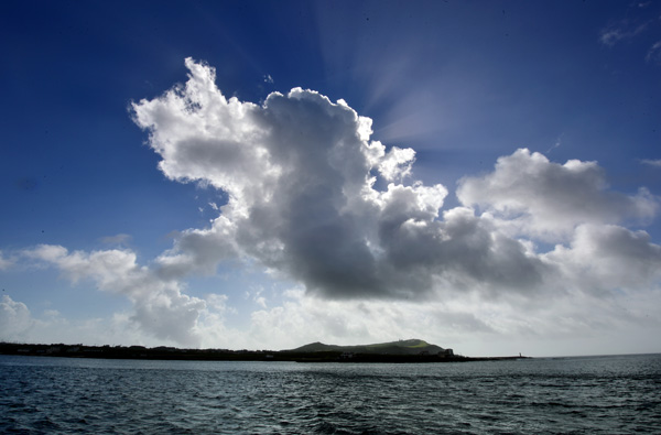 성산항에서 하우목동항을 향해 가는 뱃머리에서 바라보는 우도의 아름다운 모습이 전포망도(前浦望島)다. 우도 8경 중 가장 먼저 만나는 풍경이다. 파란 하늘 아래로 흡사 물 위에 소가 누워 있는 형상이 장관이다.