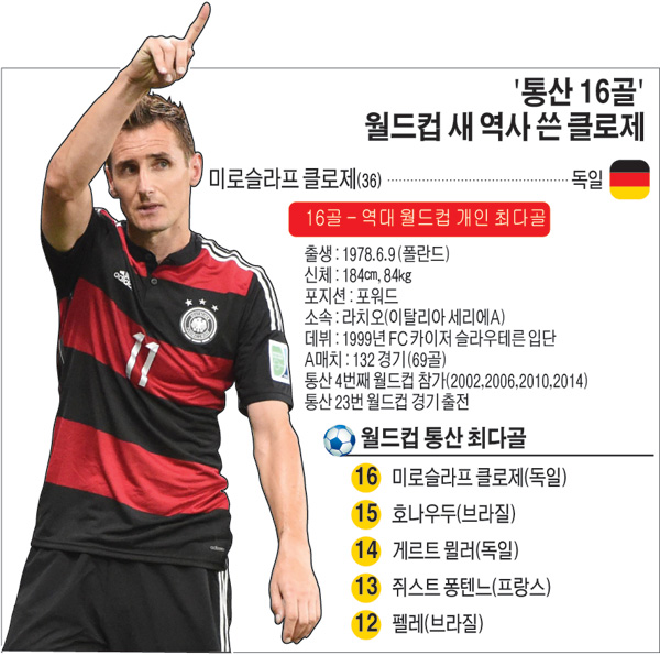 클로제는 이날 개인 통산 23번째 월드컵 경기에 출전, 로타어 마테우스(독일·25경기)에 이어 역대 최다 출전 2위에 이름을 올렸다. 파올로 말디니(이탈리아·23경기)가 공동 2위다.