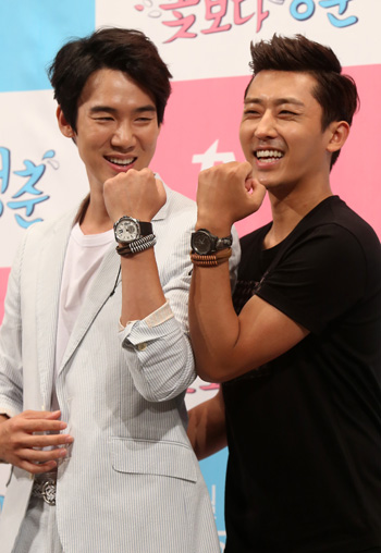 지난 28일 오후 서울 강남구 논현동 임피리얼 팰리스 호텔에서 열린 tvN 예능 프로그램 ‘꽃보다 청춘’ 제작발표회에서 배우 유연석(왼쪽), 손호준이 포즈를 취하고 있다. /연합뉴스