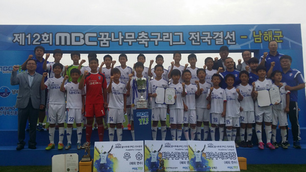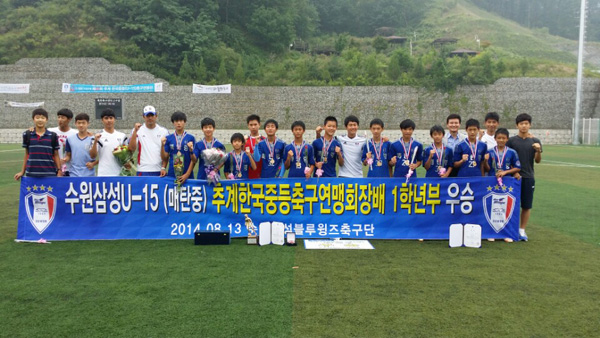 ▲ 프로축구 K리그 클래식 수원 블루윙즈의 유소년팀들이 13일 두개 대회에서 모두 우승을 차지하는 쾌거를 이뤘다. 경남 남해 스포츠파크에서 열린 제12회 MBC 꿈나무 축구리그 전국결선 AL(아카데미 및 전문육성리그)에서 우승한 12세 이하(U-12) 팀(사진 위)과 충북 제천축구센터에서 벌어진 IBK기업은행 제50회 추계 한국중등(U-15) 축구연맹전 1학년부 화랑그룹에서 정상에 오른 수원 매탄중(사진 아래)이 기념촬영을 하고 있다. /수원삼성블루윙즈프로축구단 제공 |