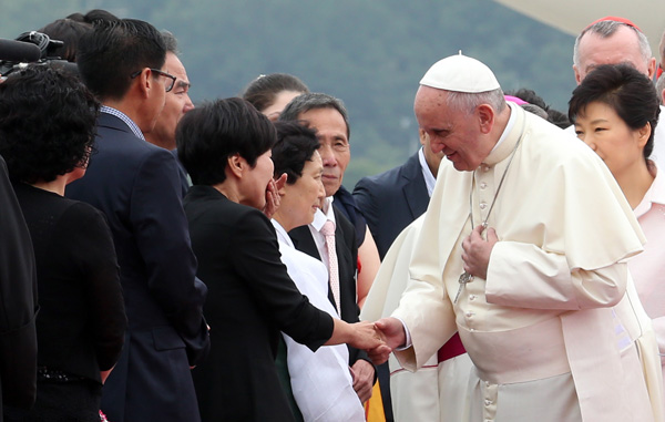 특히 중고등학생과 어르신 대표, 결혼을 앞둔 예비 신자를 비롯해 세월호 희생자 유가족, 새터민, 이주노동자, 범죄피해자 가족, 시복대상자 후손, 외국인 선교사, 수도자 대표 등 소외 계층과 일반 평신도 32명이 영접을 나와 눈길을 끌었다.