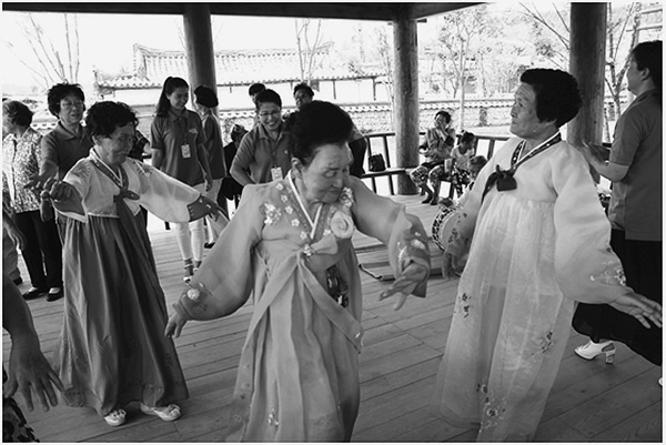 전통한옥건물들을 보자 로인들은 “야, 참 대단하우…여기에 또 이런 전통미가 넘쳐나는 곳이 있다니… 정말 좋소…”라고 칭찬하면서 누가 먼저라 없이 덩실덩실 춤을 추기 시작했다.
