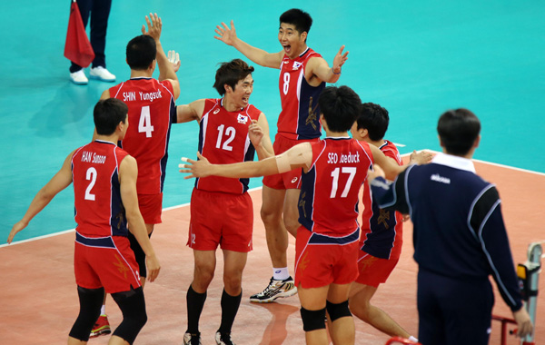 25-25까지 이어진 접전에서 서재덕의 직선 공격으로 1점만을 남겨둔 한국은 상대의 공격이 그대로 라인을 벗어나면서 경기를 마무리했다./연합뉴스