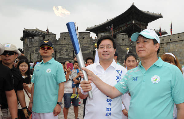 성화봉송단을 맞이한 염태영 수원시장은 “문화와 체육의 도시 수원을 방문한 성화봉송단을 환영한다”며 “수원에서도 대회 일부가 개최되는 만큼 아시안게임 성공개최를 위해 적극 협조할 것”이라고 말했다.
